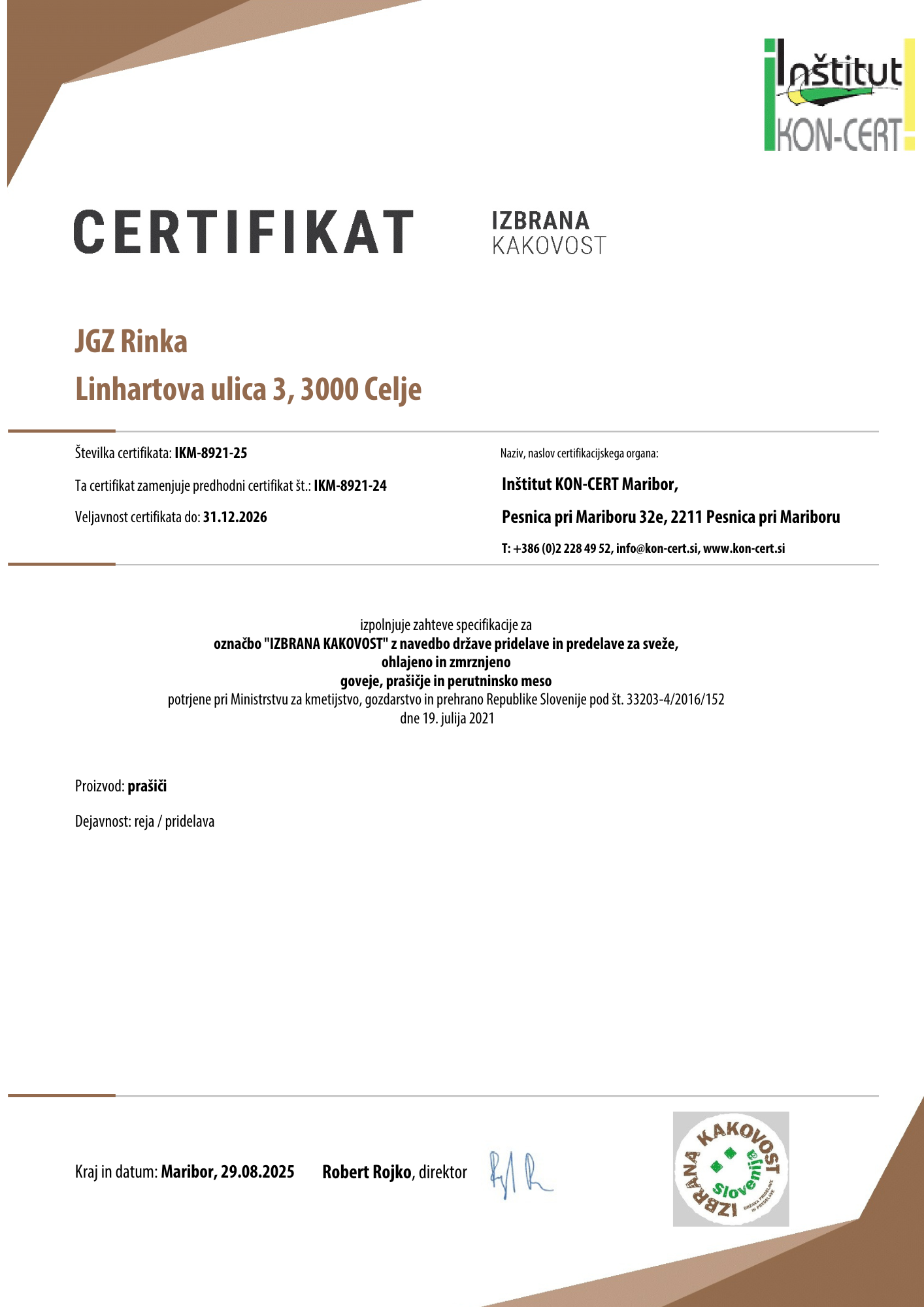 Na JGZ Rinka se že desetletja trudimo ponuditi našim naročnikom naraven izdelek, ki spoštuje tradicionalen način reje. Živino hranimo izključno s krmo, ki temelji na naravni pridelavi lastne koruze, pšenice in ječmena, brez gensko spremenjenih komponent.