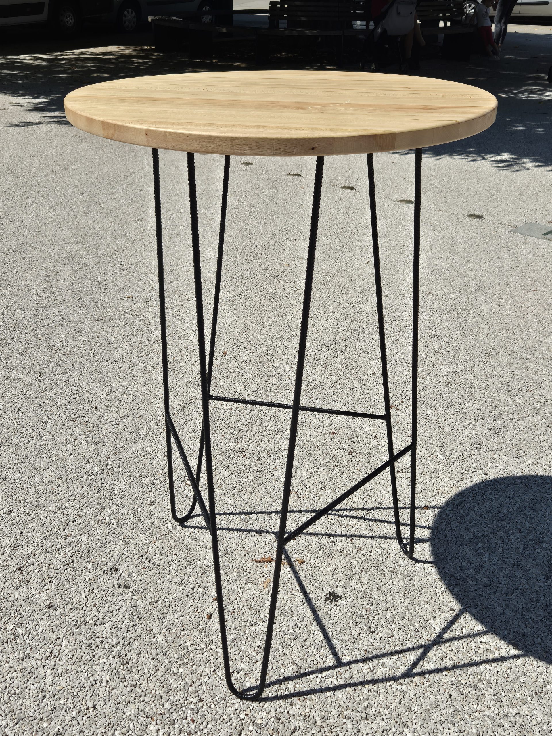 Elegantna barska miza z okroglo ploščo iz masivne parjene bukve, lakirano za dolgo obstojnost in enostavno čiščenje. Stabilno kovinsko podnožje, prašno barvano za sodoben videz in vzdržljivost, poskrbi za varno uporabo v domačem prostoru, gostinskem lokalu ali pisarni.